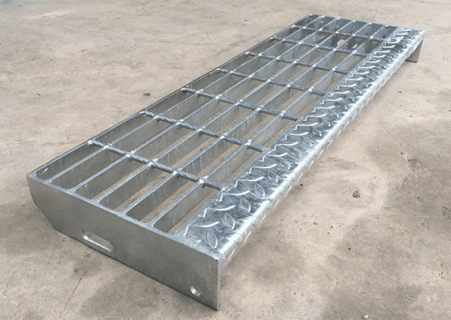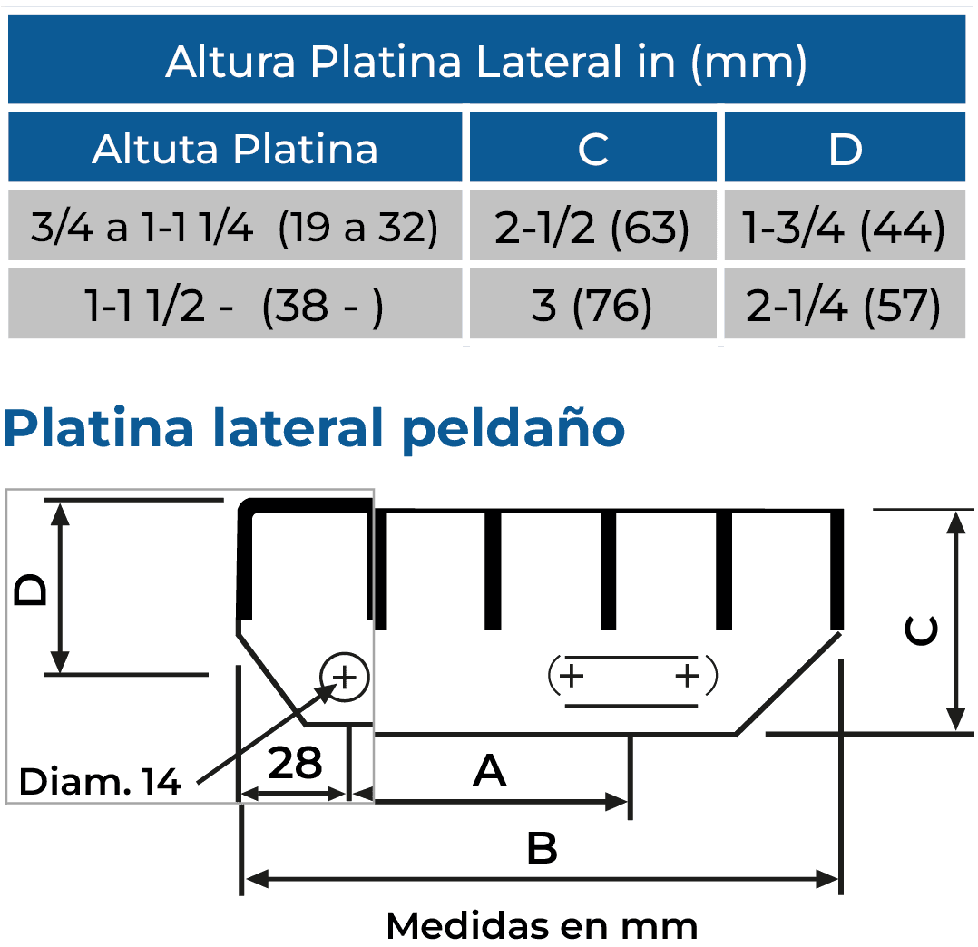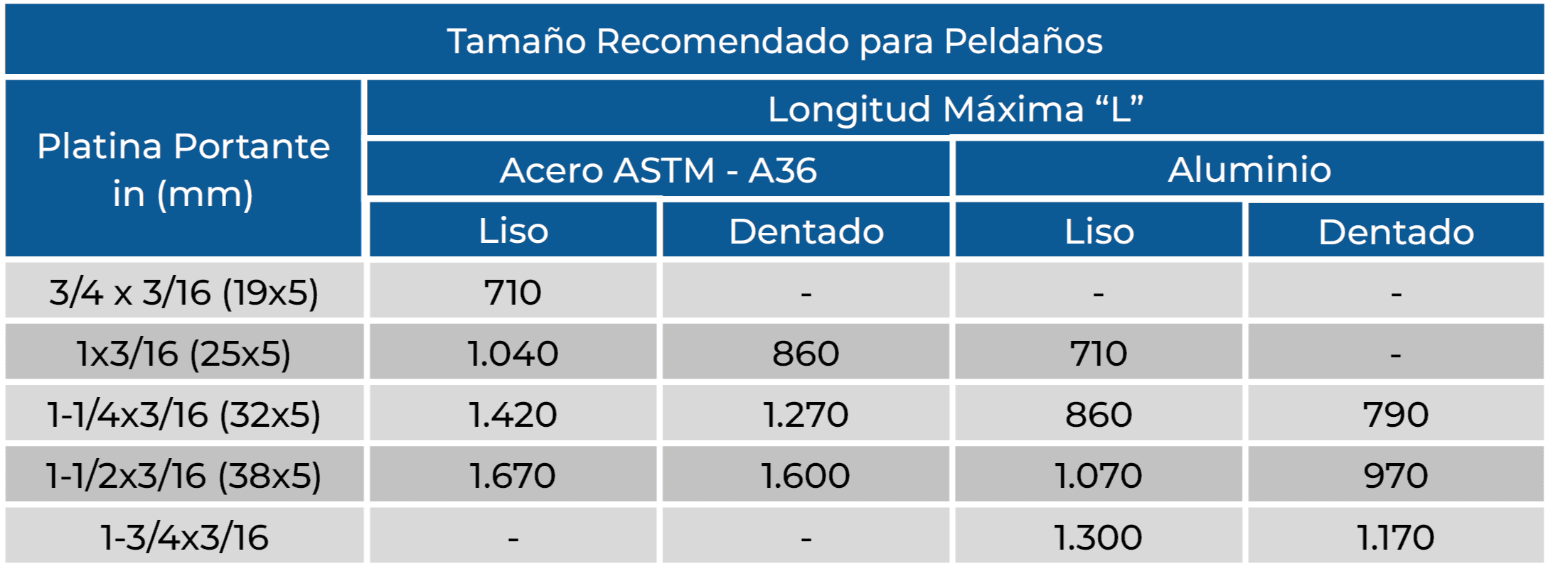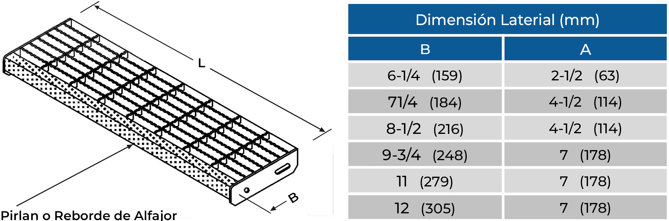El frente de los peldaños incluye una lámina antirrapante figurada en forma de “L” con bordes redondeados. Su instalación puede realizarse mediante pernos, tornillos, grapas de fijación o soldadura, siendo los tornillos el método más común. Para ello, se utiliza una lámina lateral perforada, ajustada a los estándares definidos o a las necesidades del cliente.